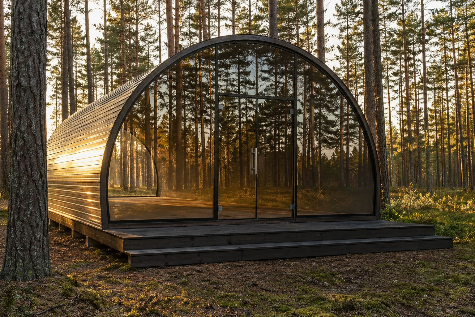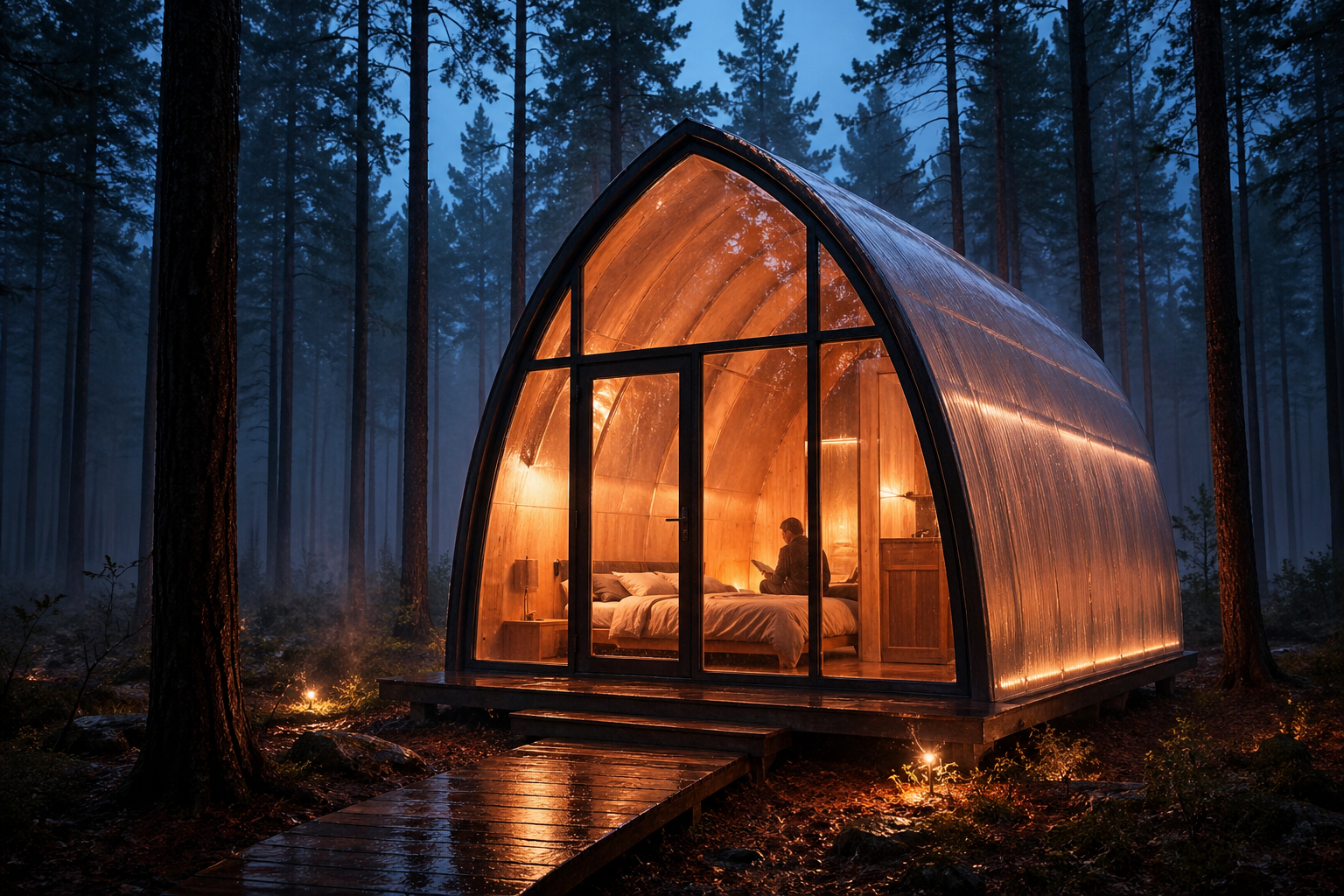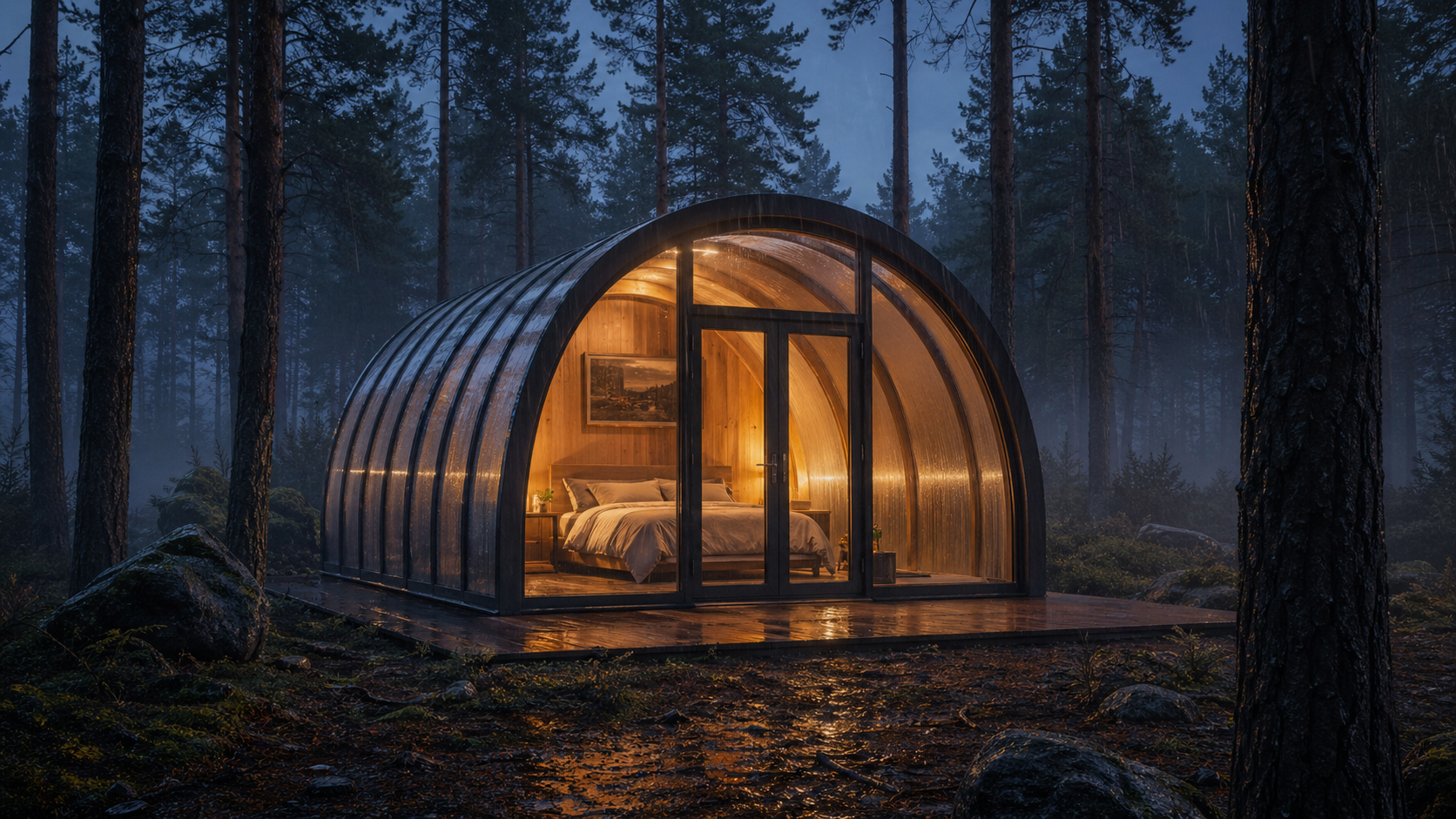Тёплый свет в арке, сосны вокруг, дождь по стеклу. Booking от €100/ночь.
