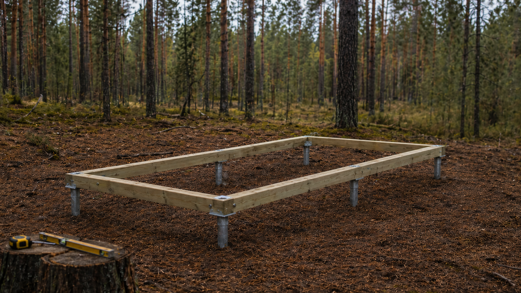 6 свай 76×2500 мм вкручиваются вдвоём за 3 часа. Нижняя обвязка из бруса 100×150.