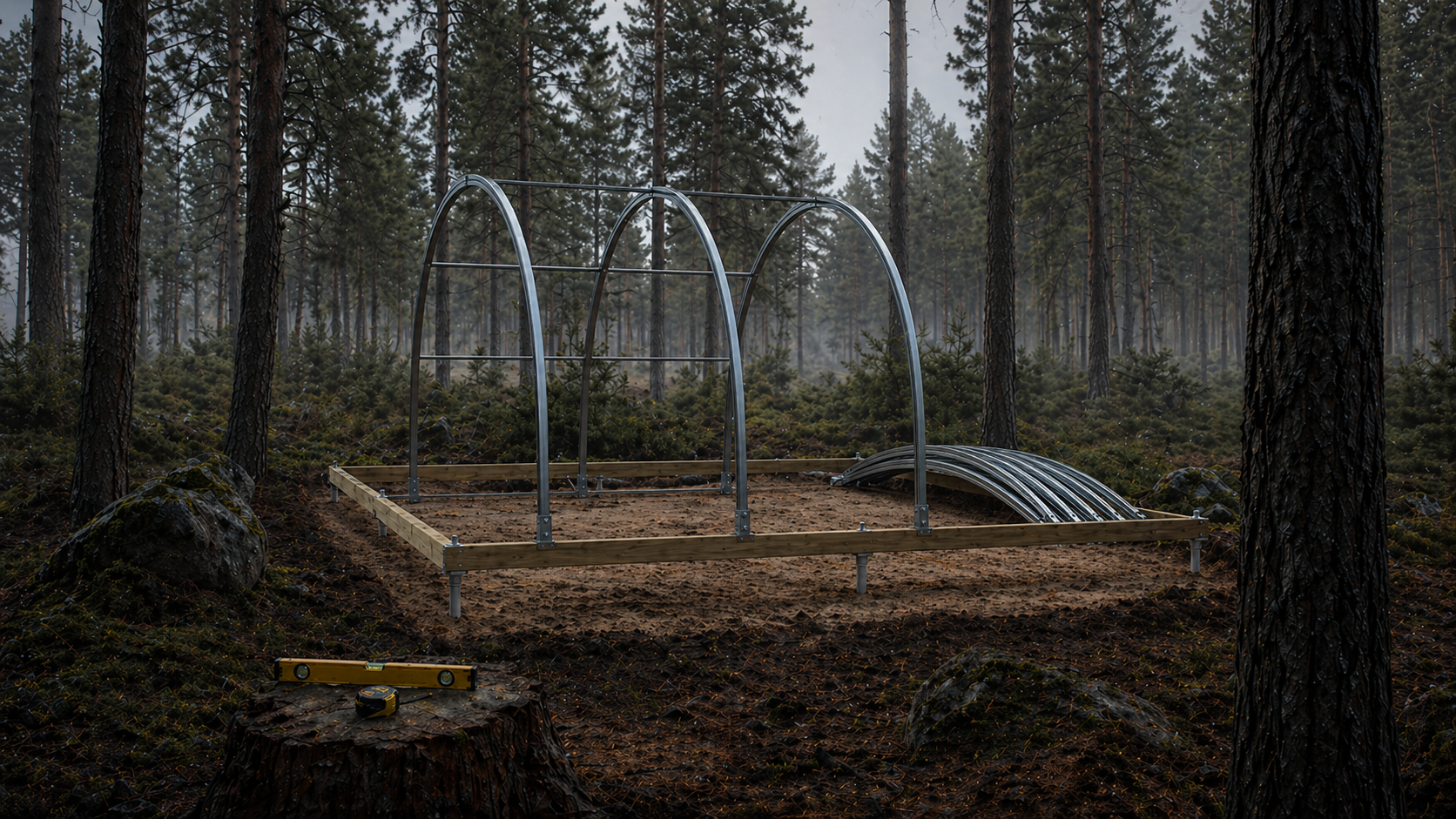 12 стальных арок 50×30×2 мм, гнутые на трубогибе у местного цеха. Без сварки на участке.