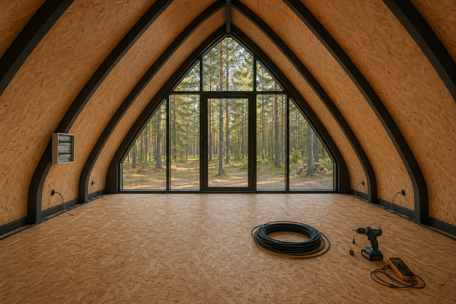 OSB‑3 22 мм, винил‑ламинат, проводка под штукатурку, щиток на 6 линий.