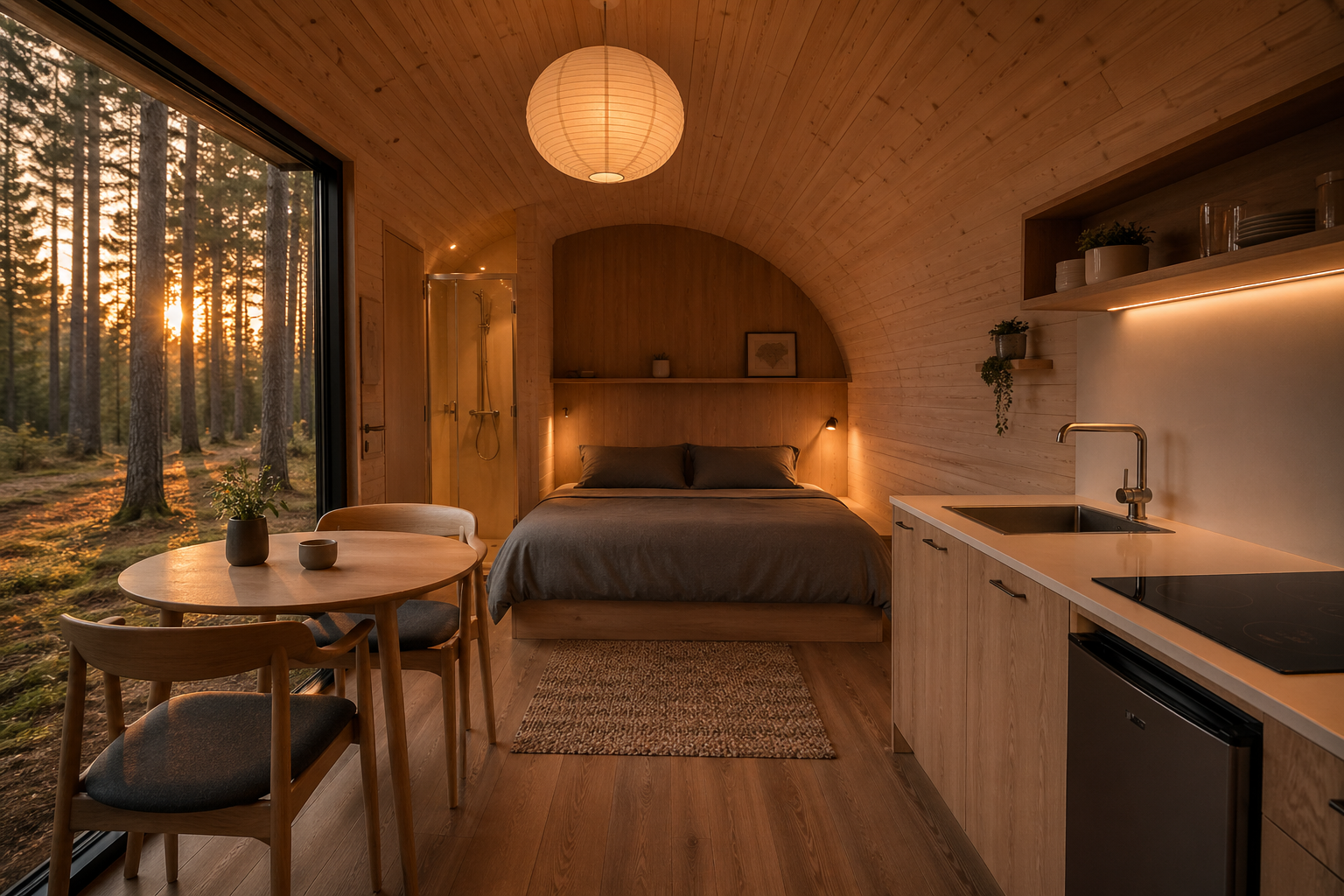 Кровать MALM, мини‑кухня с индукцией, душ 80×80, биотуалет или септик.